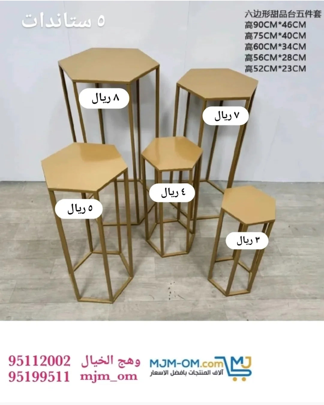 مجموعة من 5 استاندات معدنية بأحجام متعددة (من 20 سم إلى 100 سم) مثالية لتزيين حفلات الزفاف والمناسبات. تصميم عصري يناسب جميع الأذواق. الأسعار تبدأ من 2 ريال فقط.