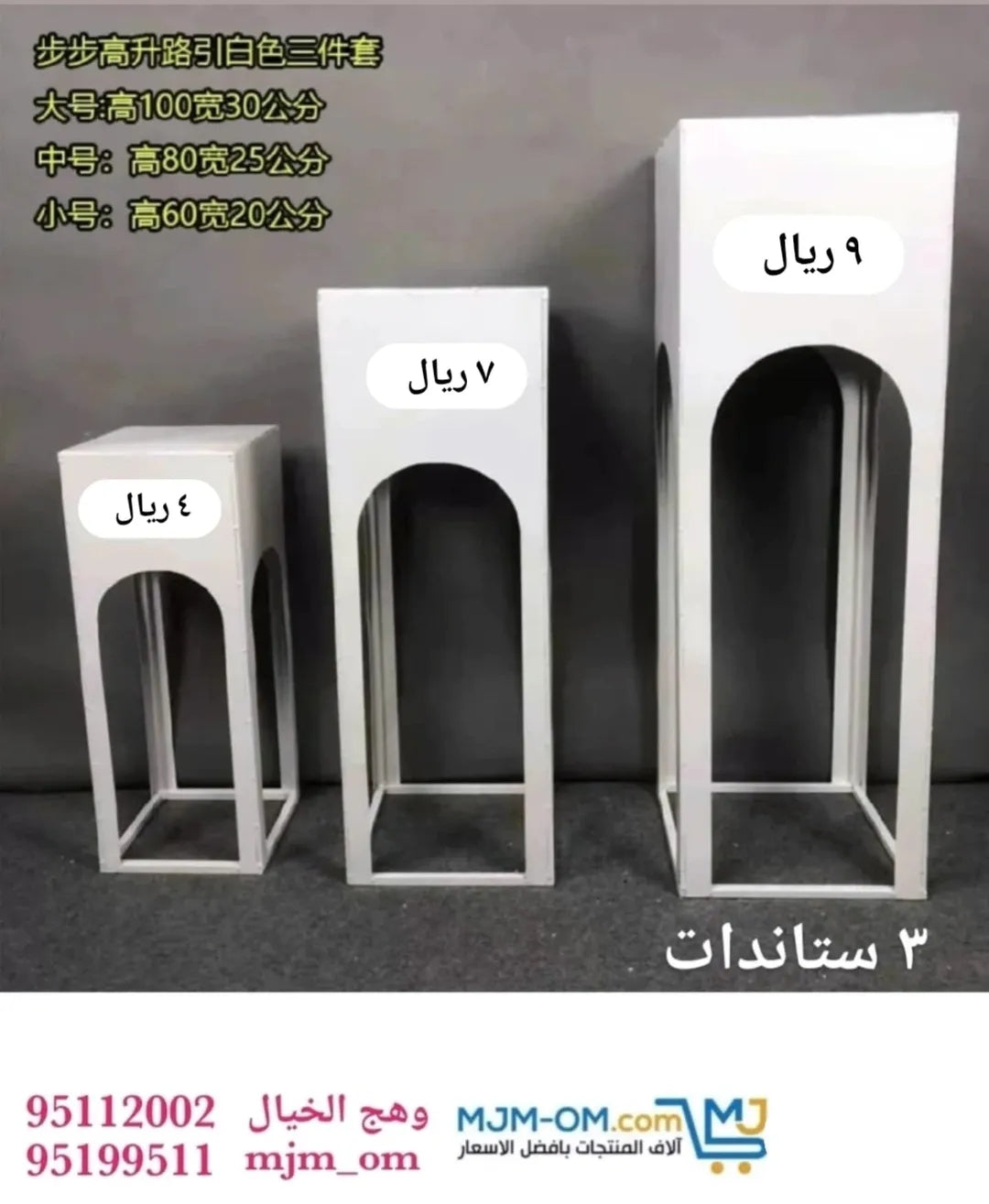 مجموعة راقية من 3 حوامل عرض مزهريات بقاعدة مربعة وهيكل معدني متين، بأحجام متدرجة تناسب جميع تنسيقات الديكور. مثالية لحفلات الزفاف، الفعاليات الرسمية، وتنسيقات الورود.