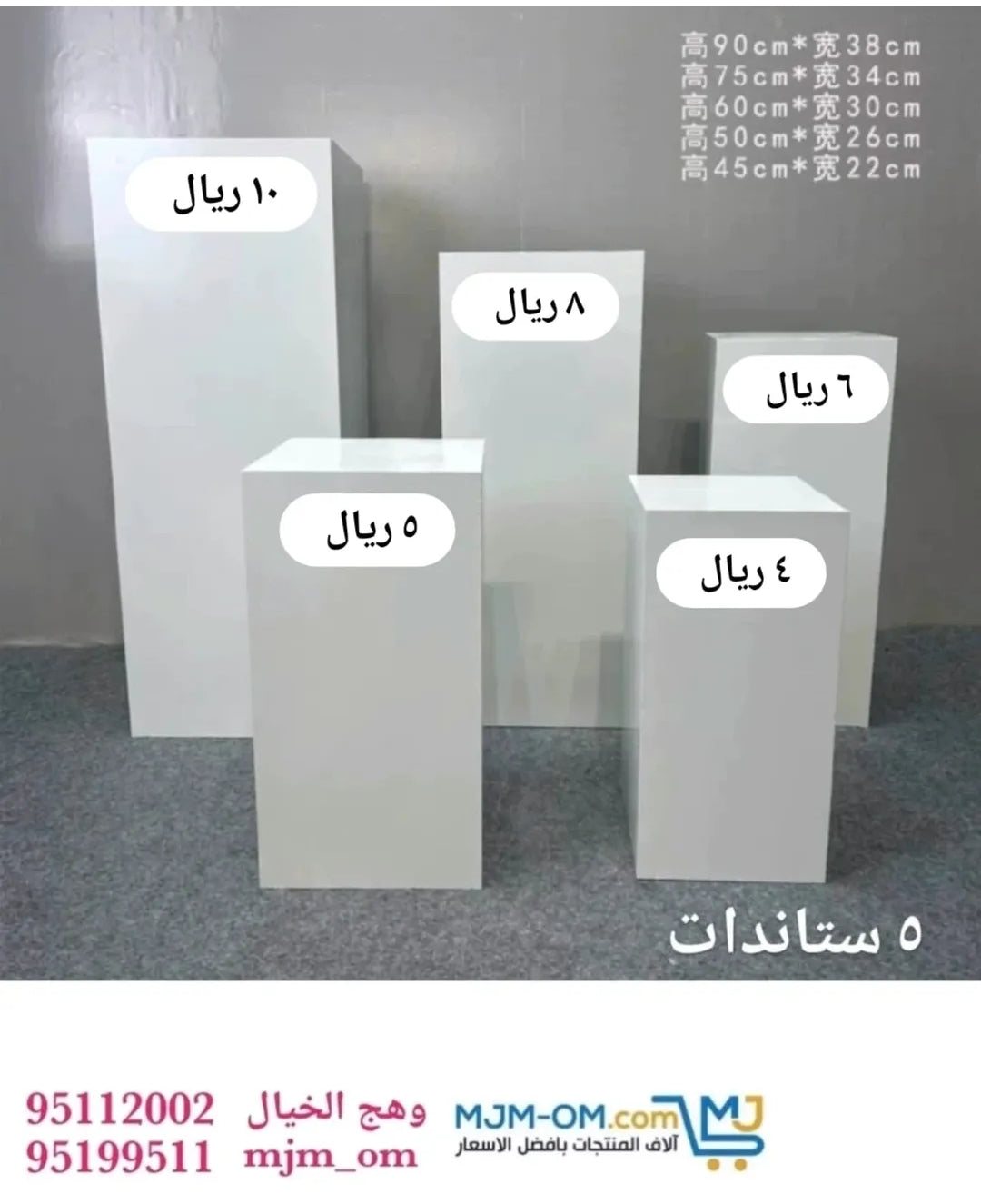 مجموعة من 5 استاندات معدنية بأحجام مختلفة (من 20 سم إلى 100 سم)، مثالية لتزيين حفلات الزفاف والمناسبات. تصميم عصري يضفي لمسة من الفخامة على أي مكان. الأسعار تبدأ من 2 ريال فقط.